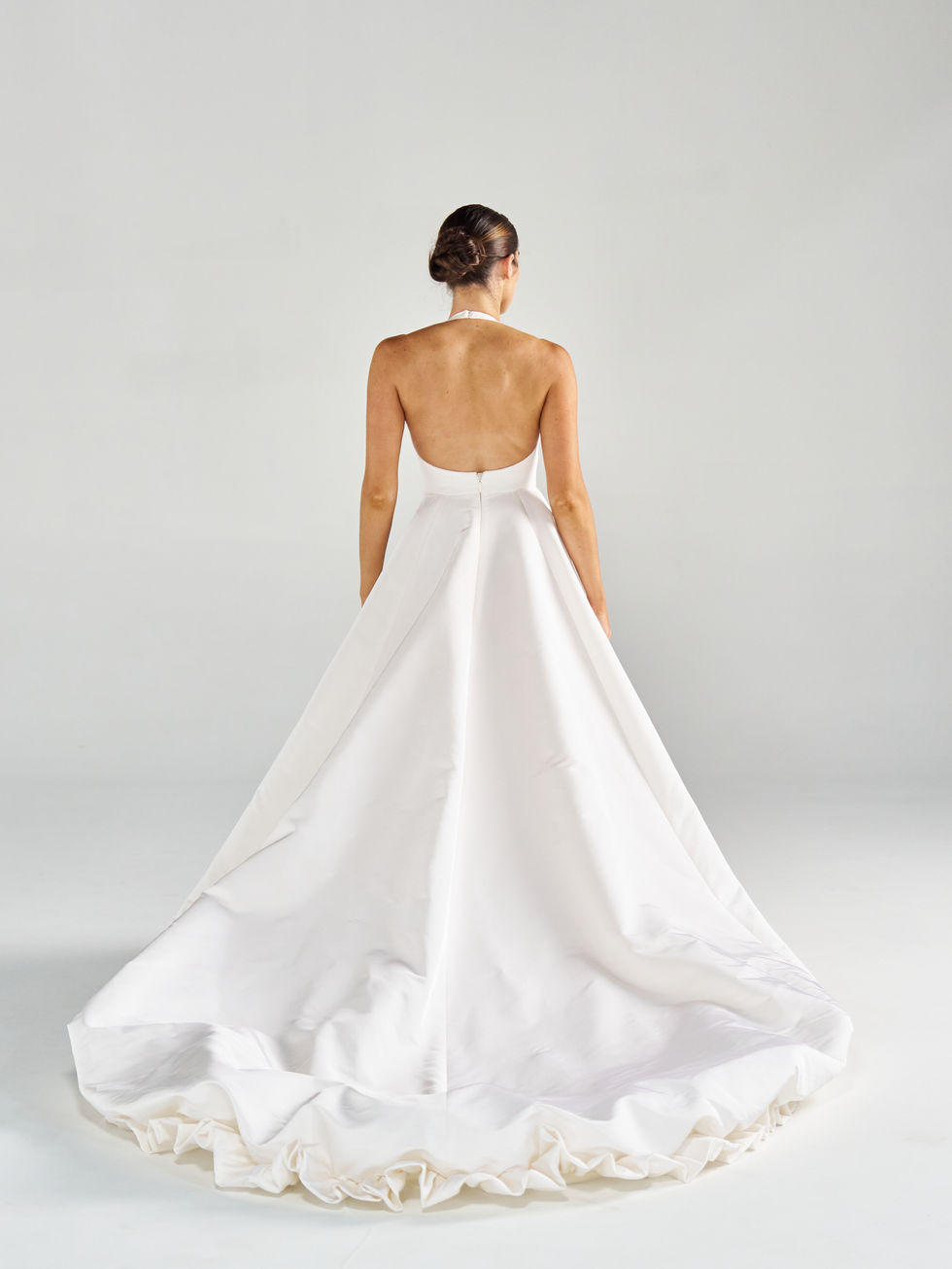 Silk faille halter neck ballgown featuring a structured bodice with princess seams and an open back. Full skirt with pockets and bubble hem delicately lined in ruffles along the train’s hemline. Two covered buttons fasten the halter at the neck. Internal boning in bodice and invisible zipper closure at center back.