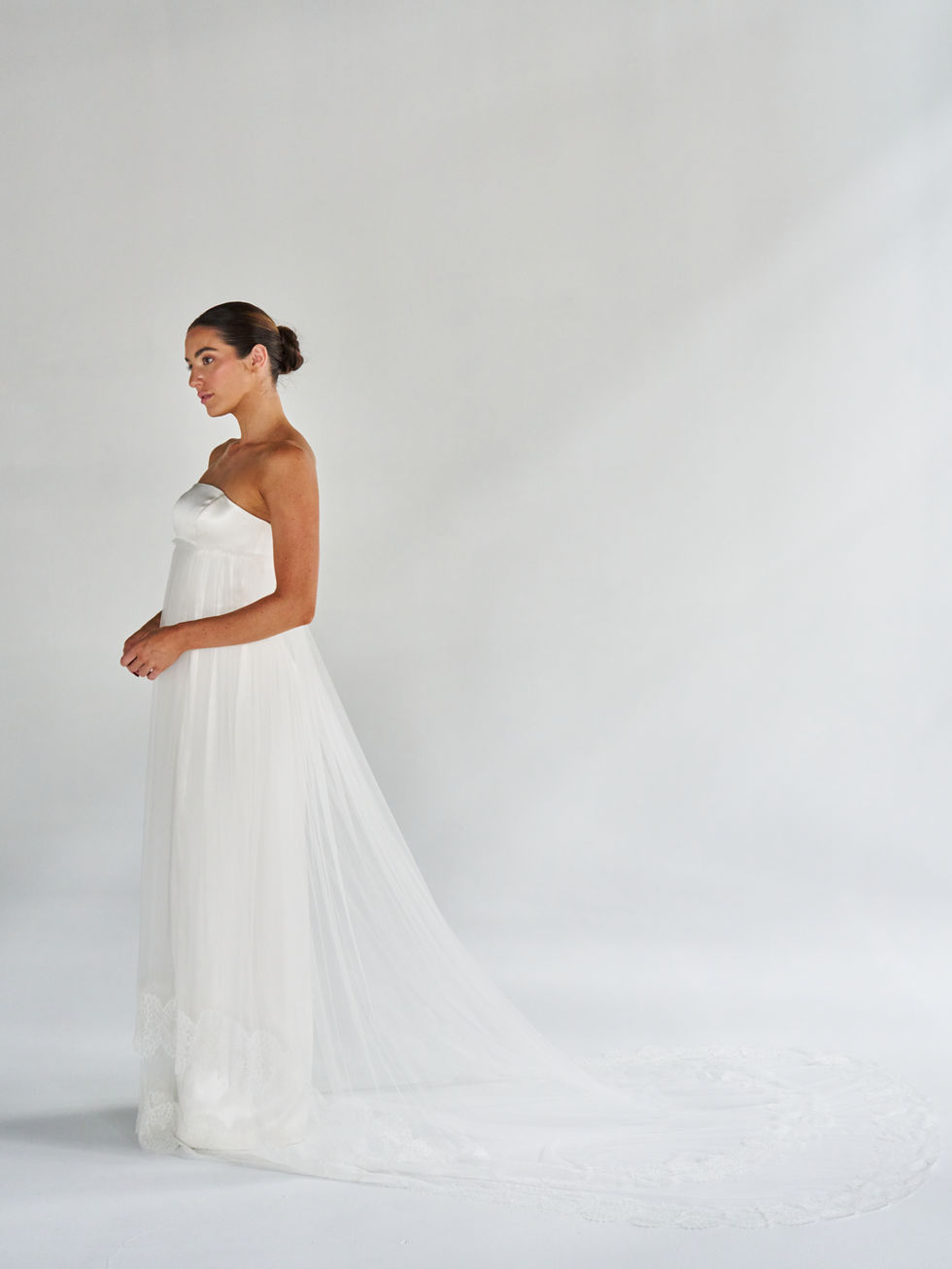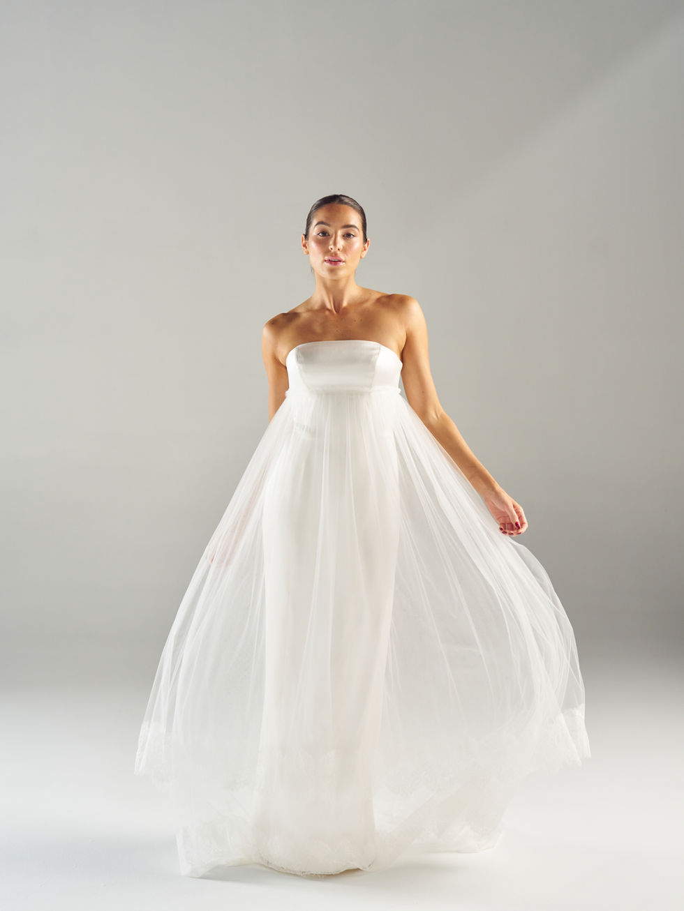 Silk dual satin column gown featuring internal corset structure and strapless empire waist overlay of two layers of tulle with raw hem under the bust. Delicate French lace adorns the hem of each tulle layer. Internal grosgrain belt and Invisible zipper closure at back.