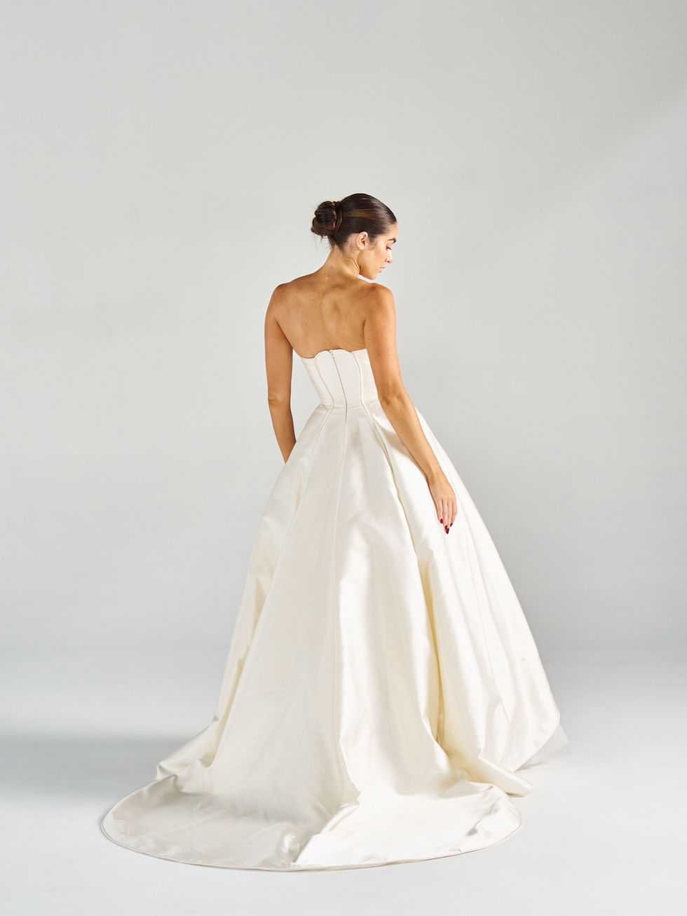 Silk wool Mikado blend strapless ballgown with fan-like arching neckline and a structured bodice. Full skirt supported by an underskirt of gazar and silk satin organza to enhance the skirt ’s signature tulip shape. Silk wool Mikado cording detail along seams throughout. Bodice features internal boning structure, internal grosgrain belt and invisible zip closure at center back.