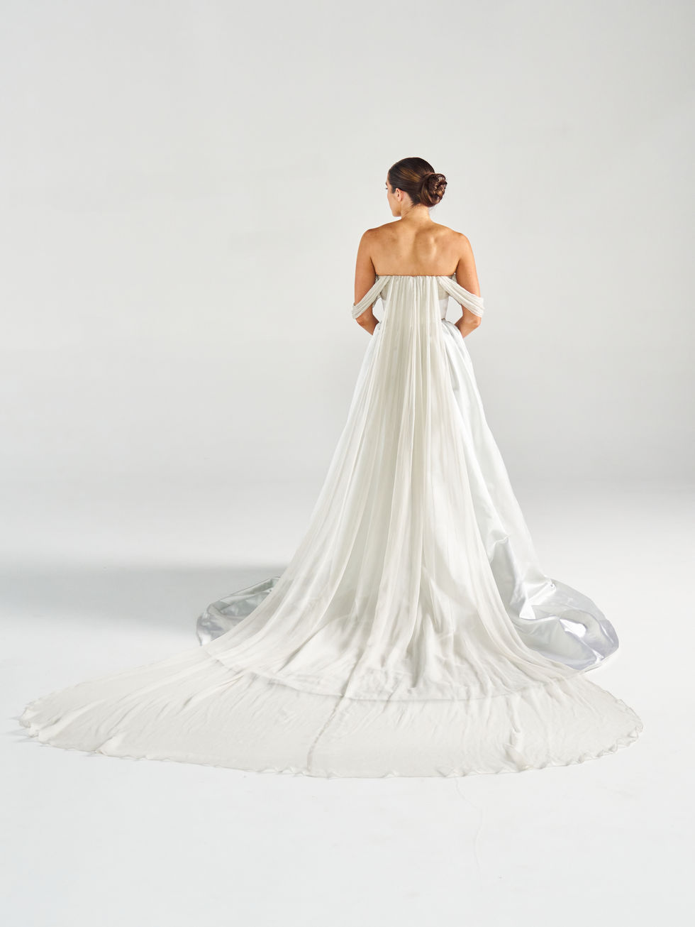 Basque waist silk duchesse satin ball gown with structured bodice. Silk crinkle chiffon overlay frames the bust and transcends into draped off-the-shoulder sleeves. Removeable silk crinkle chiffon watteau train fastens as cape at center back. Bodice features internal boning structure, internal grosgrain belt and invisible zip closure at center back.